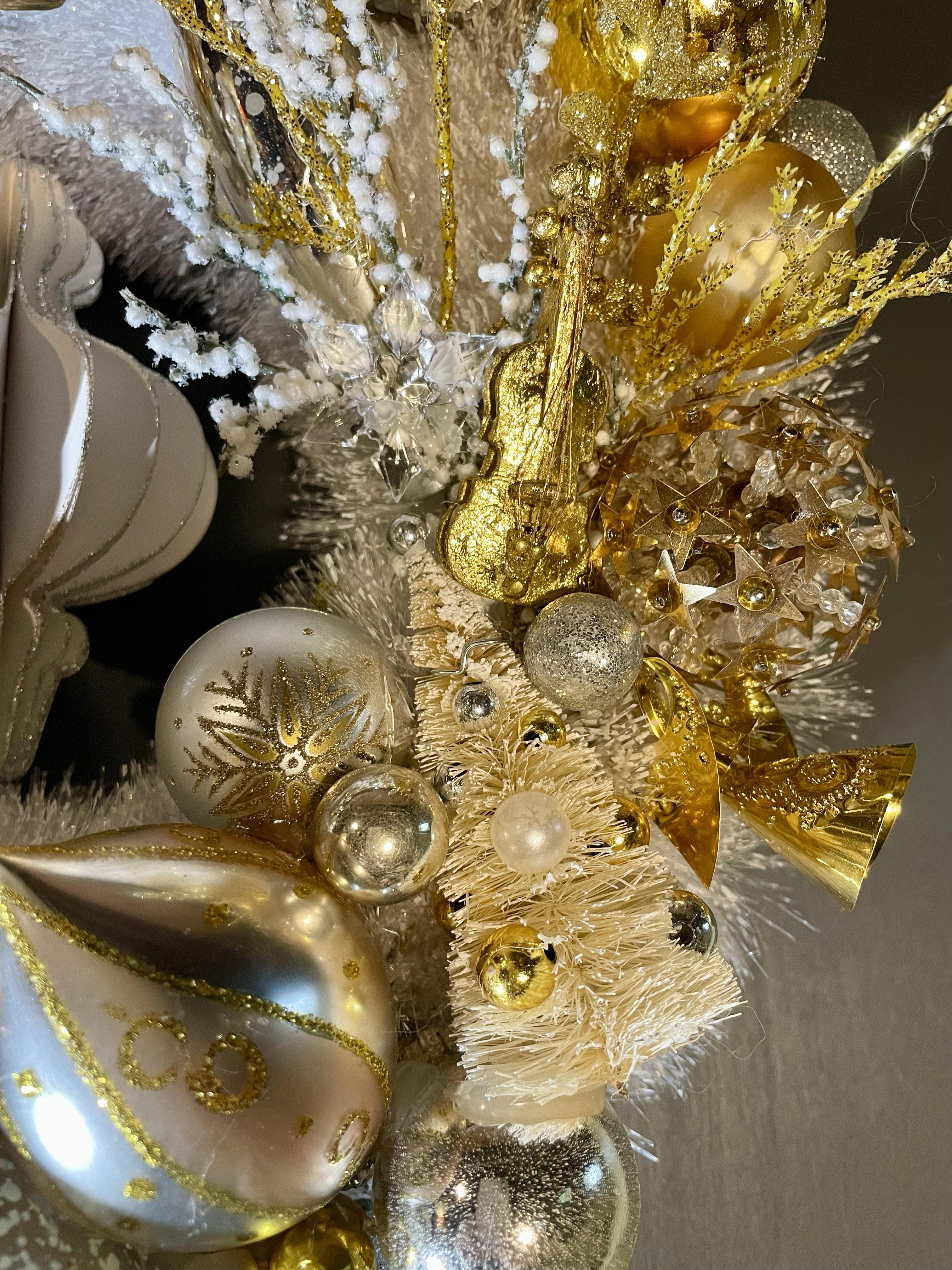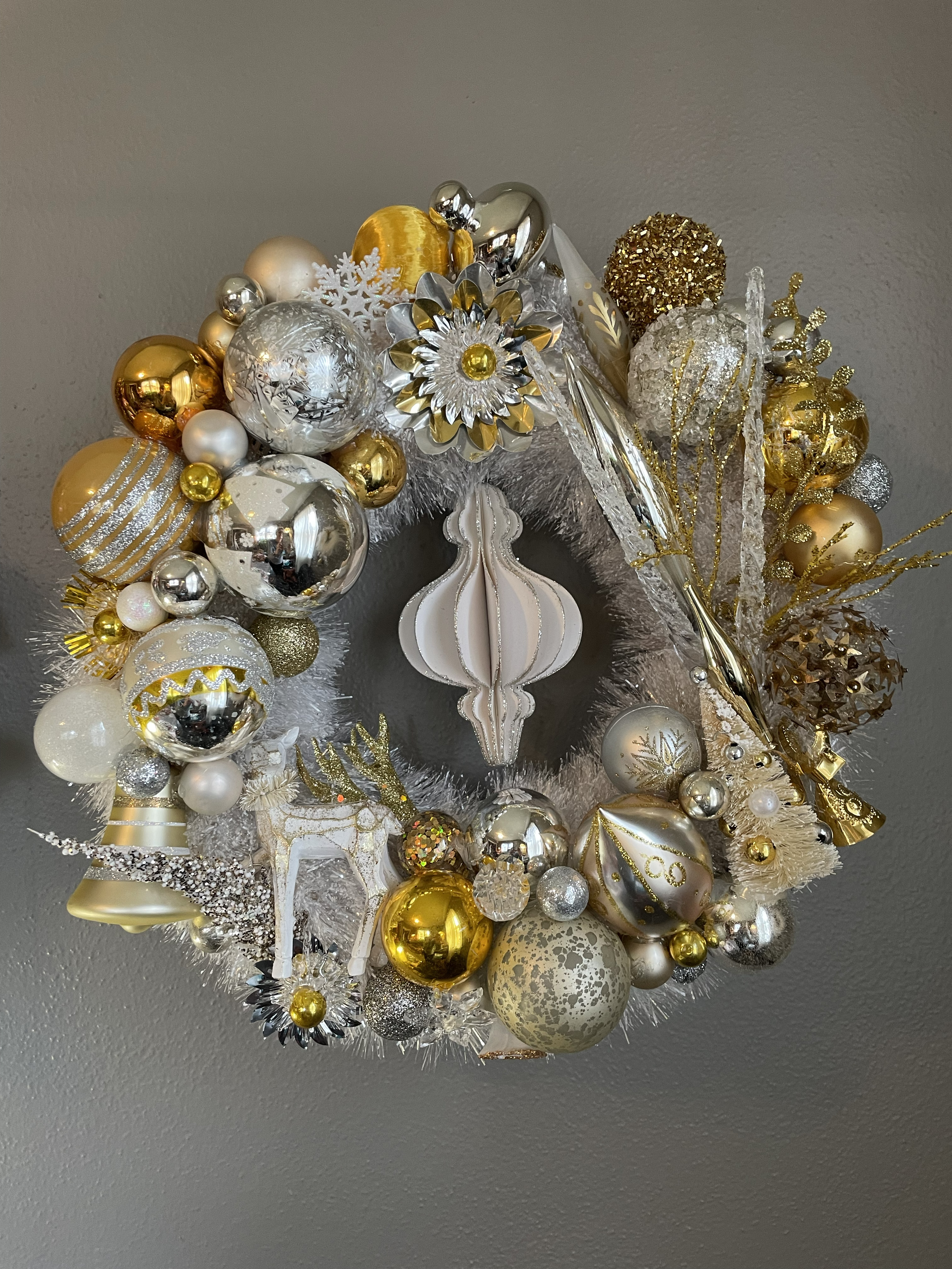 This timeless wreath is carefully constructed with mostly vintage treasures from the past, using gold, silver and white ornaments throughout.